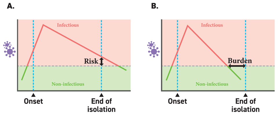 Thus, we propose different isolation guidelines accounting of the heterogeneity in viral dynamics to optimize the length of isolation each patient (or groups). For comparison of isolation guidelines, we use two metrics: the length of redundant isolation period (burden) and the probability of prematurely ending isolation (risk) (Figure). The project findings are expected to support development and assessment of different isolation guidelines in-silico. If successful, this approach can reduce both the individual and societal impact of the pandemic and to provide a framework that could be applied to other emerging or remerging infectious diseases.